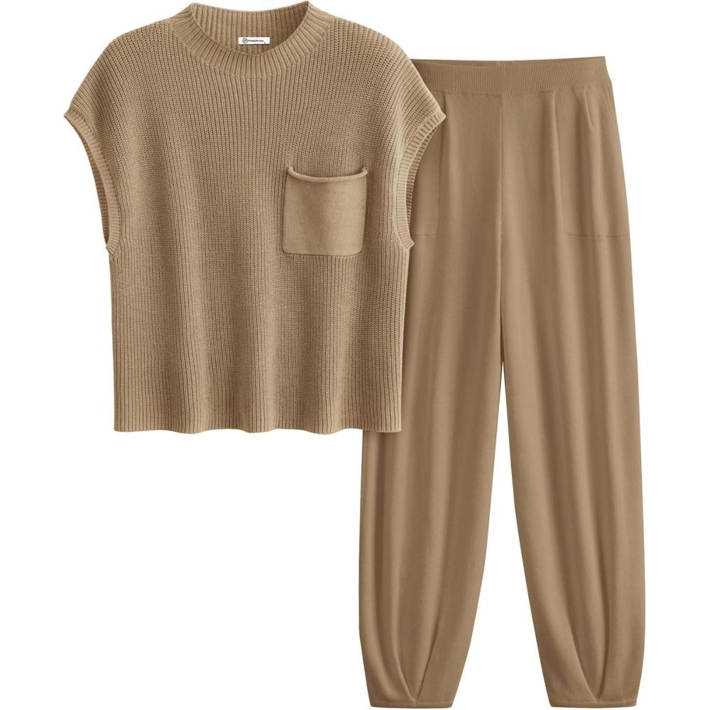 PRETTYGARDEN 2 Piece Outfits for Women Summer 2026 Knit Vest Tops Sweatpants Spring Beach Vacation Travel Sweater Lounge Set(Khaki)