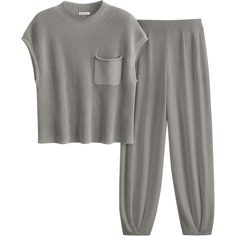 PRETTYGARDEN 2 Piece Outfits for Women Summer 2026 Knit Vest Tops Sweatpants Spring Beach Vacation Travel Sweater Lounge Set(Light Grey)