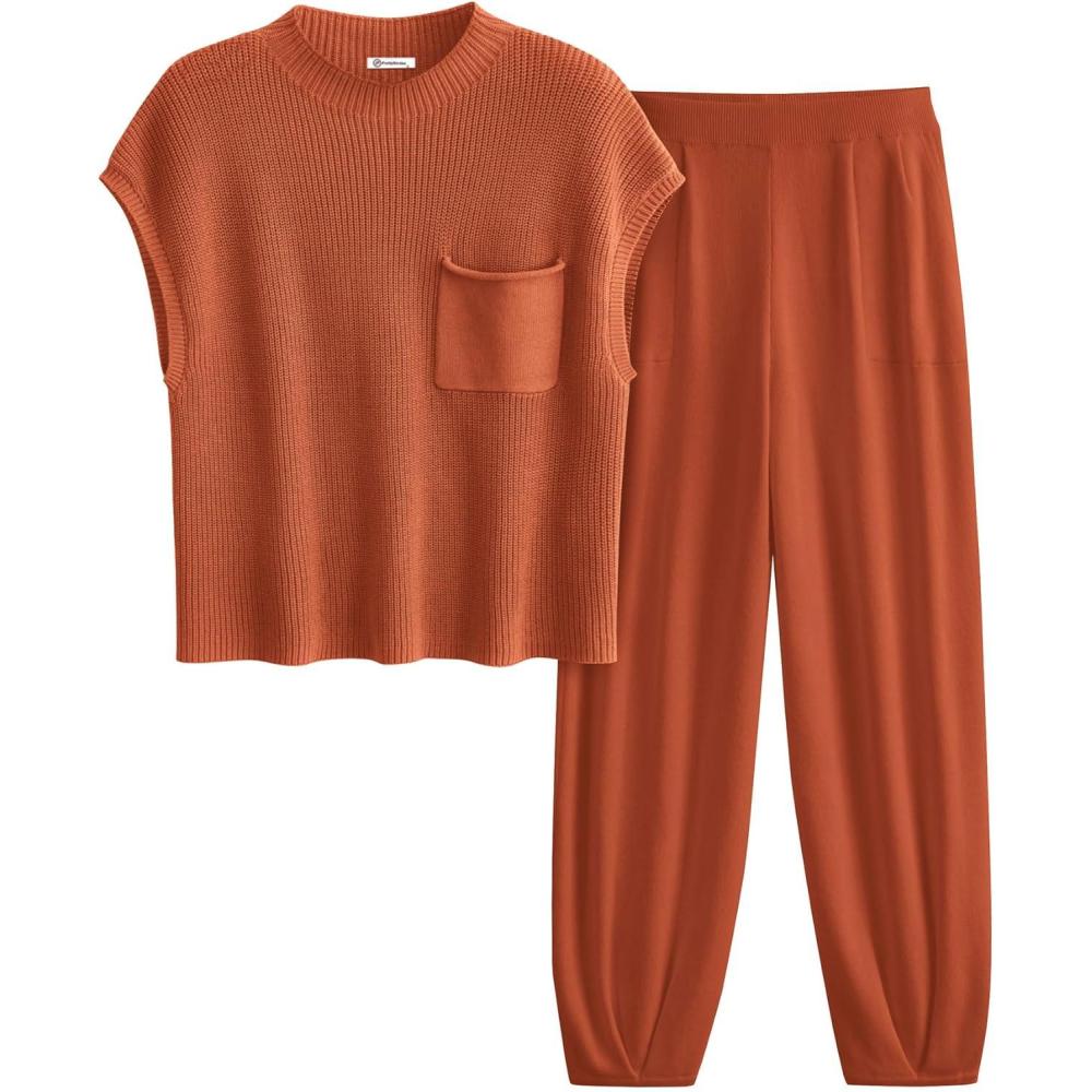 PRETTYGARDEN 2 Piece Outfits for Women Summer 2026 Knit Vest Tops Sweatpants Spring Beach Vacation Travel Sweater Lounge Set(Rust Red)