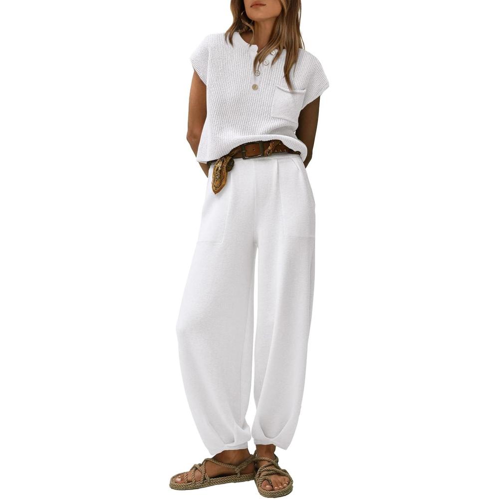 PRETTYGARDEN 2 Piece Outfits for Women Summer 2026 Knit Vest Tops Sweatpants Spring Beach Vacation Travel Sweater Lounge Set(White)