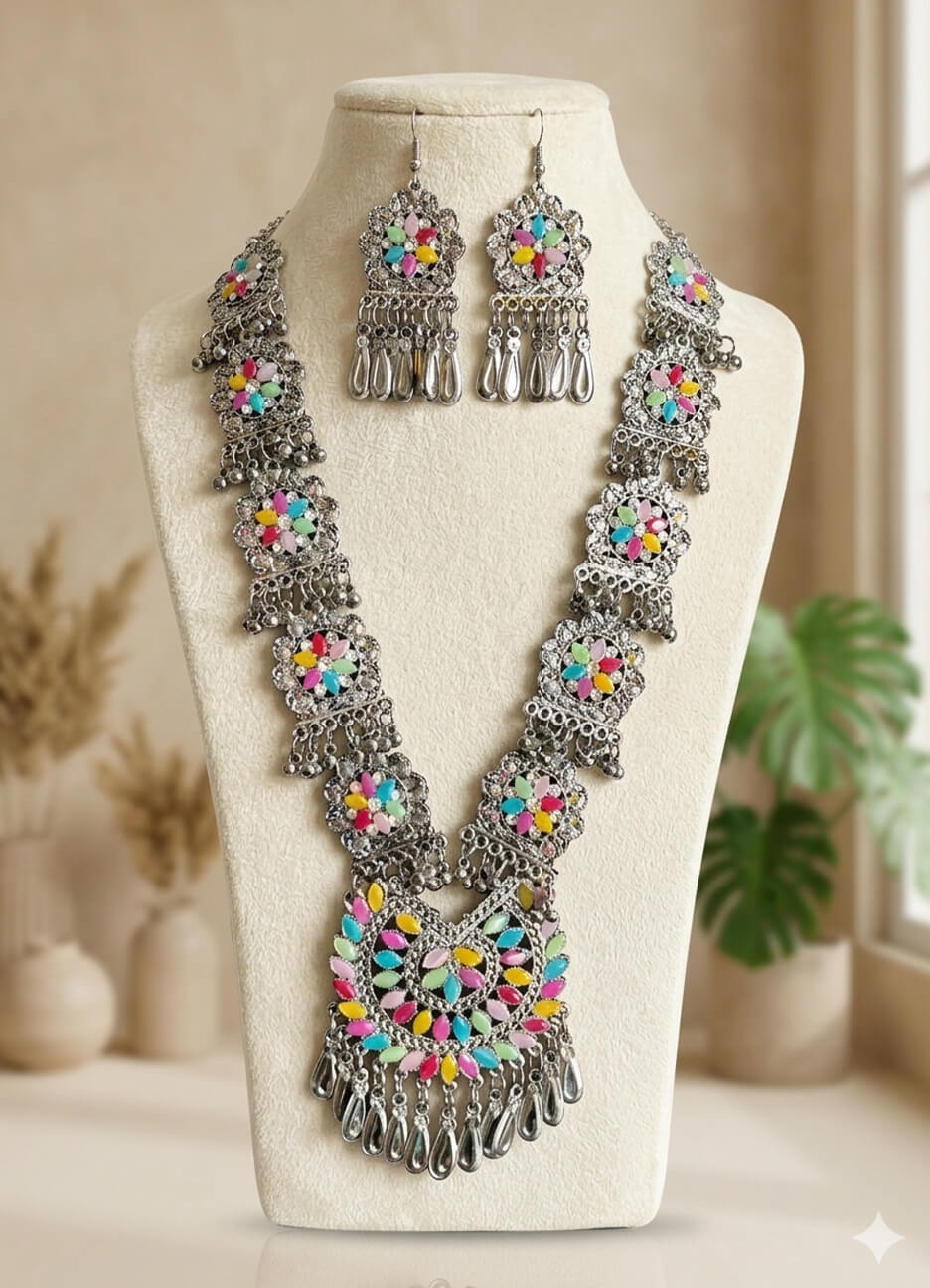 Elegant Silver-Tone Necklace & Earrings Set with Colorful Accents