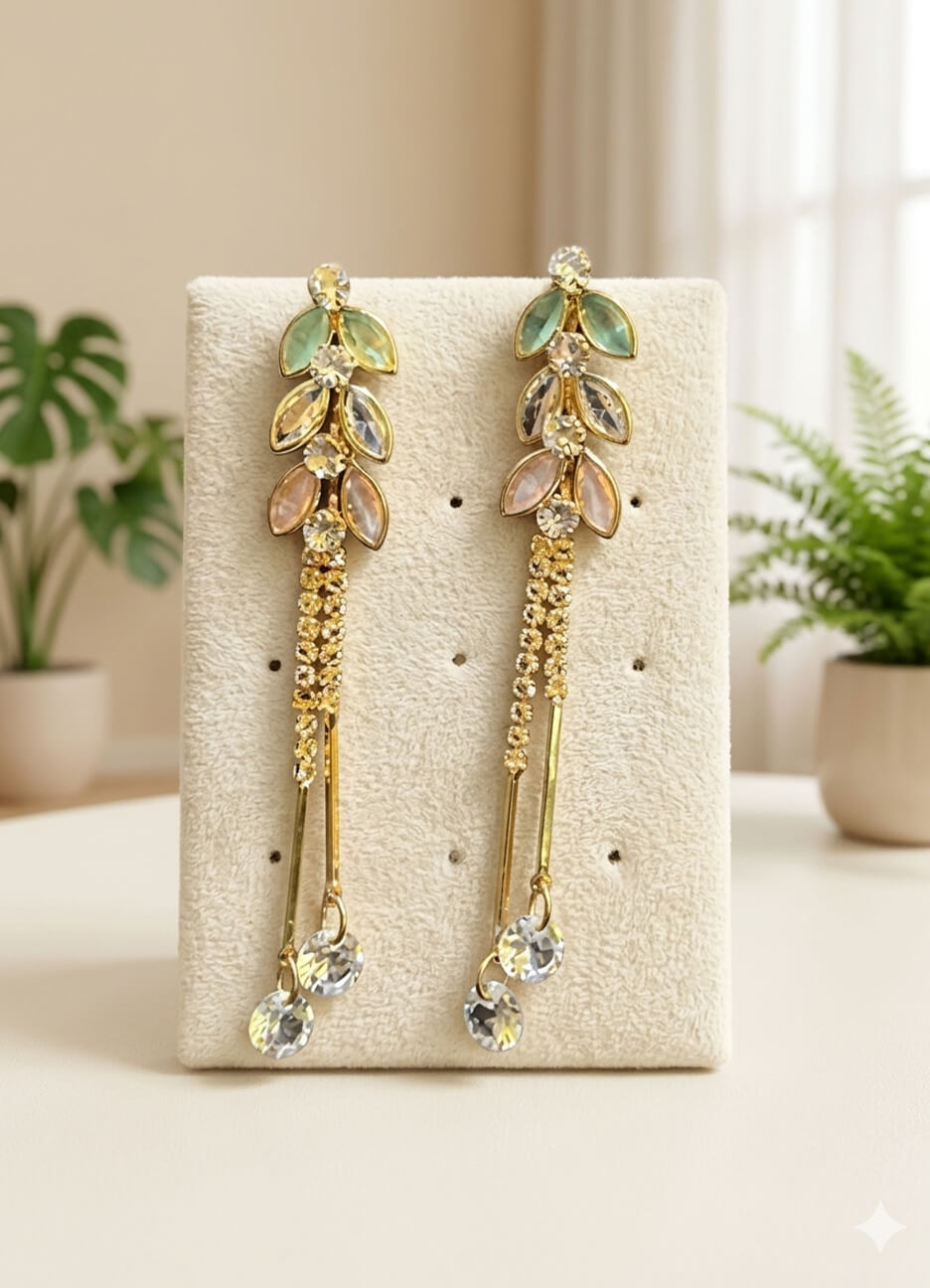Golden Leaf Drop Earrings with Crystal Accents