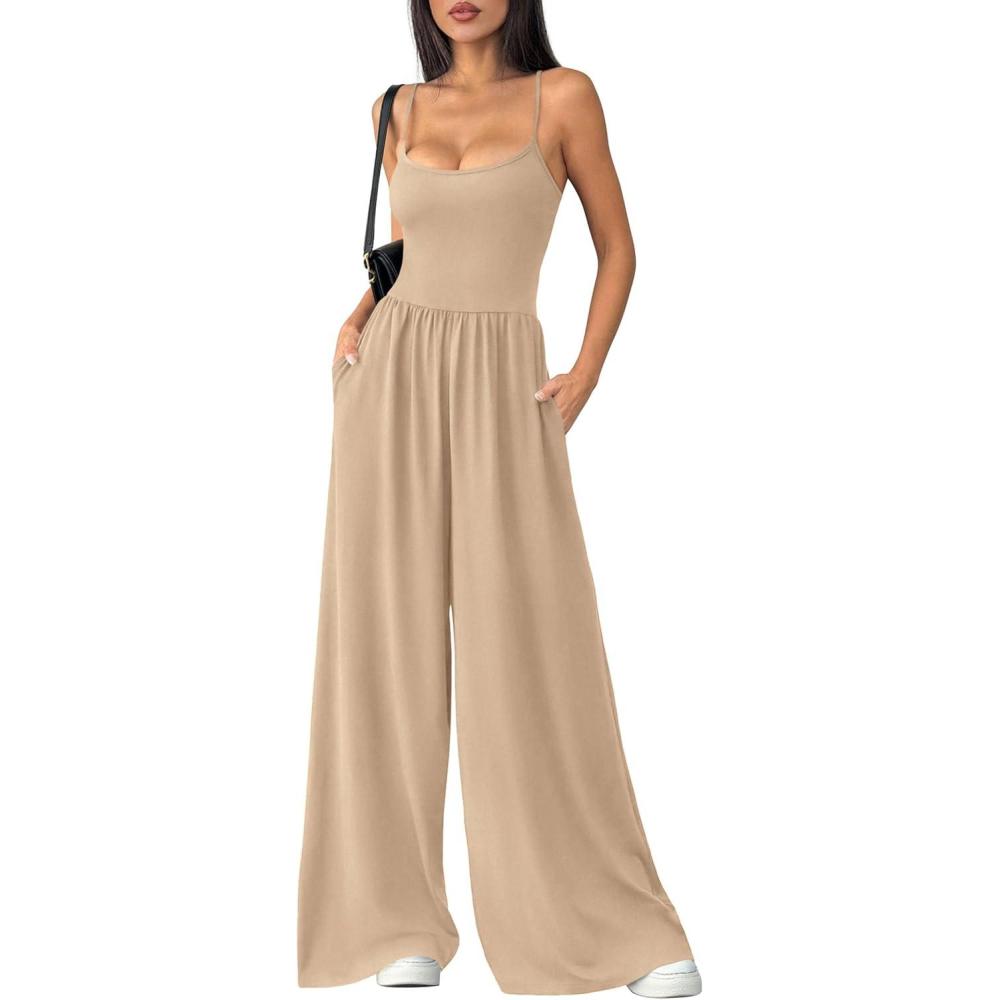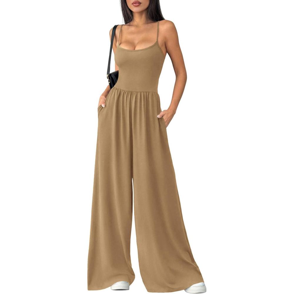 PRETTYGARDEN Jumpsuits for Women 2026 Sleeveless Strap Wide Leg Date Night Rompers Beach Vacation One Piece Summer Outfits(Khaki)
