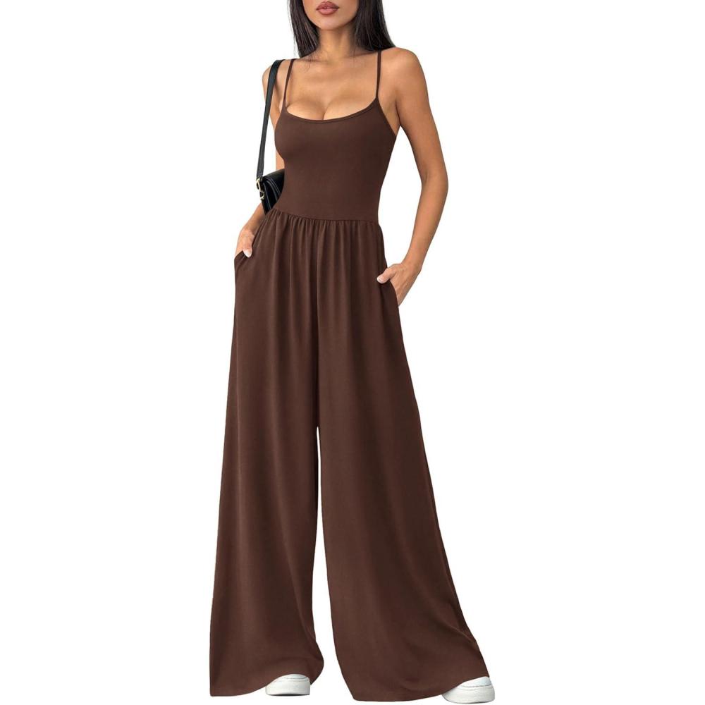 PRETTYGARDEN Jumpsuits for Women 2026 Sleeveless Strap Wide Leg Date Night Rompers Beach Vacation One Piece Summer Outfits(Brown)