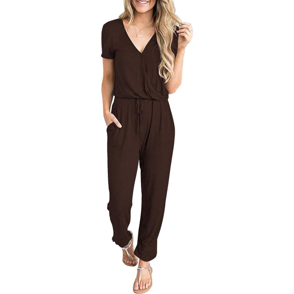PRETTYGARDEN Jumpsuits for Women 2026 Spring Summer Casual Dressy Short Sleeve Romper Airport Vacation Travel Outfits(Coffee)