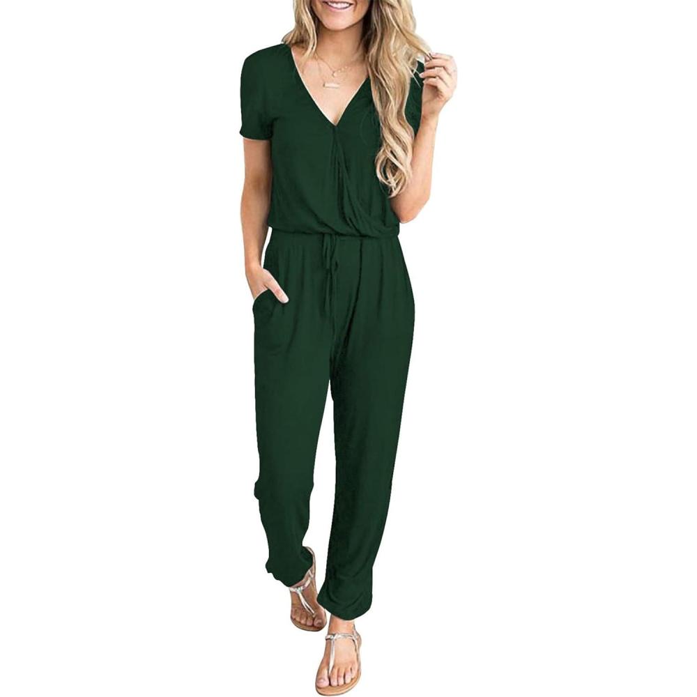 PRETTYGARDEN Jumpsuits for Women 2026 Spring Summer Casual Dressy Short Sleeve Romper Airport Vacation Travel Outfits(Dark Green)