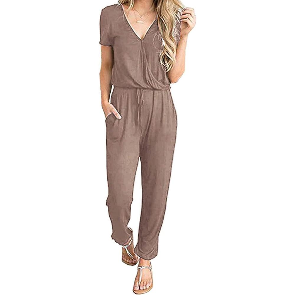 PRETTYGARDEN Jumpsuits for Women 2026 Spring Summer Casual Dressy Short Sleeve Romper Airport Vacation Travel Outfits(Dark Khaki)