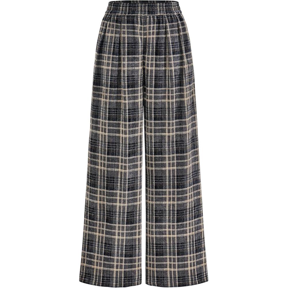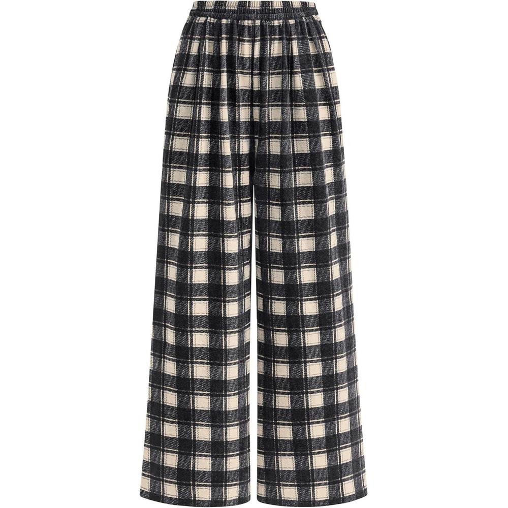 PRETTYGARDEN Casual Women’s Pants 2025 Elastic Waist Palazzo Long Pajama Wide Leg Trousers Knit Fall Outfits with Pockets(Plaid Beige Black)