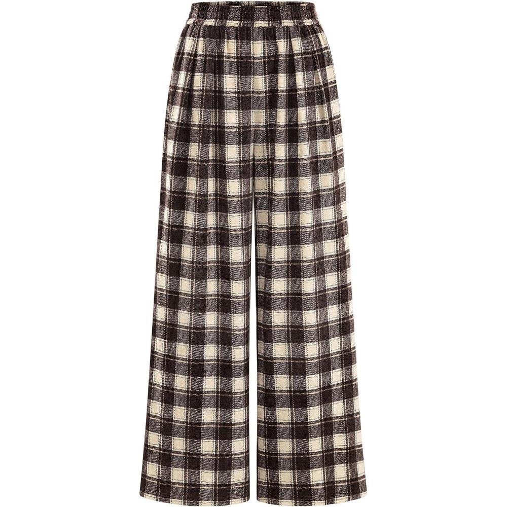 PRETTYGARDEN Casual Women’s Pants 2025 Elastic Waist Palazzo Long Pajama Wide Leg Trousers Knit Fall Outfits with Pockets(Plaid Brown Apricot)